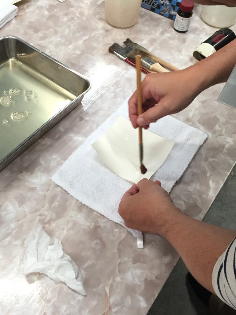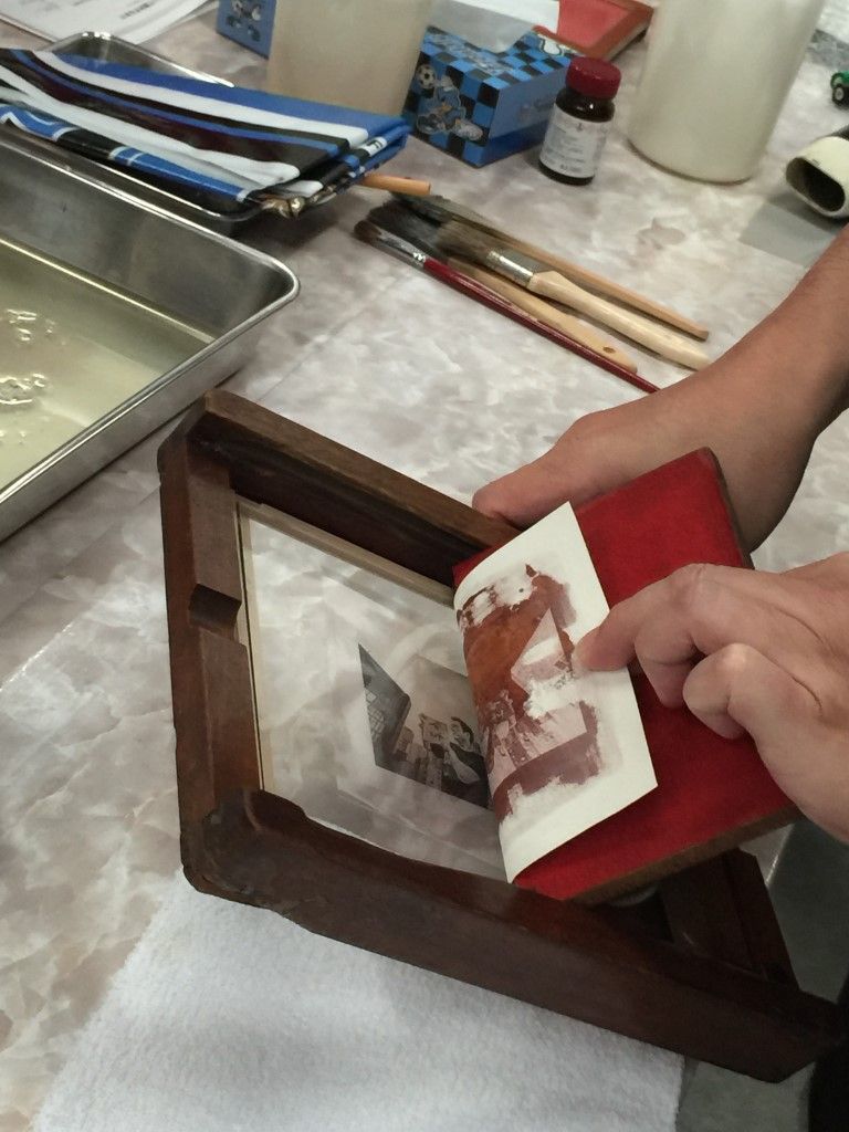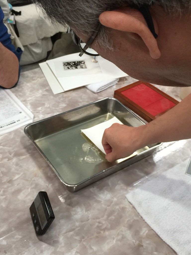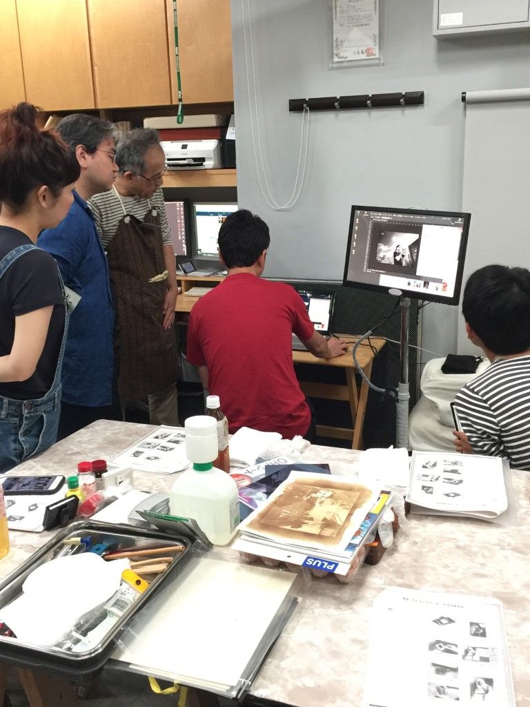 9月15日、あいにくの雨天の中、鶏卵紙ワークショップを開催しました。 写真を手作りするのはやっぱり楽しいですねぇ。 来たる7月20日(土)は、額装ワークショップです! 鶏卵紙ワークショップは9月の予定。お楽しみに! 一人日にちを勘違いして参加できませんでしたが、楽しかったですよ。9月にリベンジ開催しますので、お楽しみに! フォトショップを使ってネガ作り。 階調調整がちょっと難しいです。 ネガが完成! 鶏卵は白身だけを使います。 塩と水を入れて充分攪拌。 黄身は「オロナミンセーキ」に。結構美味しかったですよ。 漉します。 卵汁を紙に塗布。 硝酸銀溶液を作ります。 硝酸銀溶液を塗布。 焼き枠に入れて・・。 あいにくの荒天だっので、ストロボで露光。 セピア調が濃くなっていきます。 半分だけ開けて、露光状態を確認。焼き枠は便利だなぁ。 久門お手製の露光装置も大活躍! 雨の中、定着してます。 定着するとちょっと薄くなります。 水洗して感想したら完成です! 皆さんの作品はこちら。アートな名作揃いですよ。 鶏卵紙ワークショップ、次回は9月! お楽しみにっ! 関連投稿: 額装(マット切り)ワークショップの実施報告 「スマホで撮れる、スタジオライティング・ワークショップ」開催報告(3月20日) 新丸子つまみぐいゼミ㉙「遺影」はどうする?(写真道場) 額装・マットカット特別講座を開催しました。