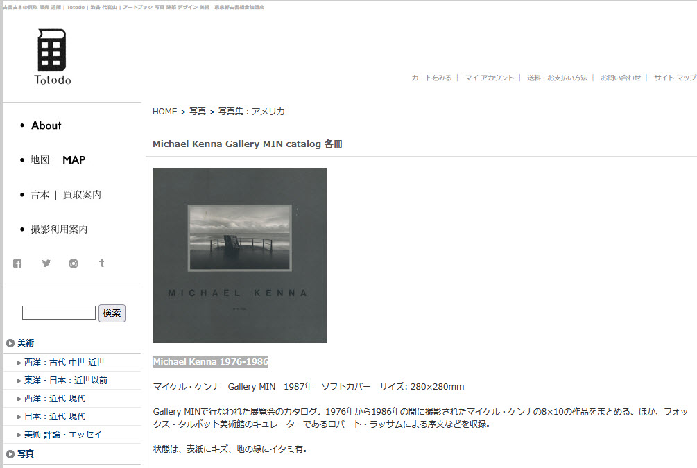 なので、ギャラリーがいつまで続いたのか、よくわかりません。ネット情報も皆無に等しいのは、本当に残念。数年とはいえ、アメリカ西海岸の作家などを日本に紹介した功績は相応のものがあるはずなのに。ネット上でただ一つだけ見つかったのは、私が在籍していた当時に作った写真集「Michael Kenna 1976-1986」で、は発行が1987年となっています。これだけでもあるだけマシか・・・。どなたか、写真史の1ページとして、ちゃんと書いてくれないかなぁ。