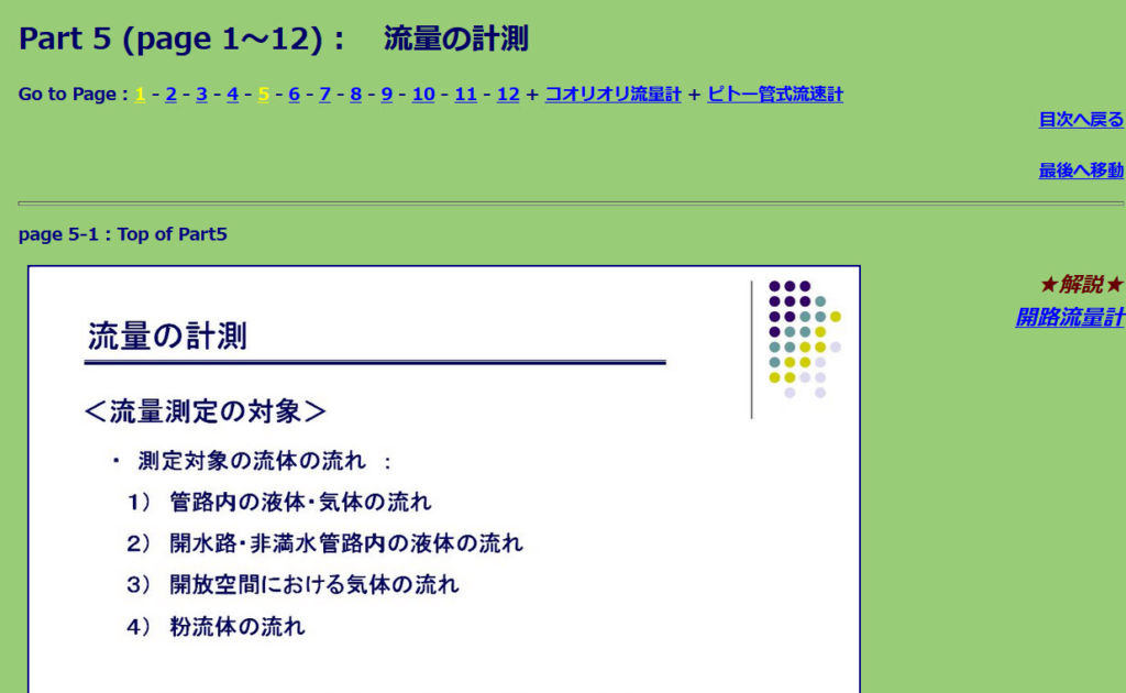 とてもわかりやすかったのは、こちらのページ。「Part 5 (page 1~12) : 流量の計測」